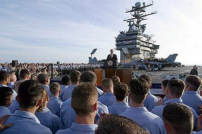 Vielen Dank Ihnen allen. Admiral Kelly, Kapitän Card, Offiziere und Matrosen der USS Abraham Lincoln, meine lieben amerikanischen Mitbürger: Die Kampfhandlungen im Irak sind weitgehend beendet. In der Schlacht im Irak haben die Vereinigten Staaten und ihre Bündnispartner obsiegt. Und nun ist unsere Koalition dabei, dieses Land zu sichern und wieder aufzubauen. In dieser Schlacht haben wir für die Sache der Freiheit und für Frieden auf der Welt gekämpft. Unsere Nation und unsere Koalition sind stolz auf diese Leistung - dennoch sind es Sie, die Angehörigen des Militärs der Vereinigten Staaten, die dies vollbracht haben. Ihr Mut, Ihre Bereitschaft, sich für Ihr Land und füreinander der Gefahr auszusetzen, hat diesen Tag ermöglicht. Dank Ihnen ist unsere Nation sicherer. Dank Ihnen ist der Tyrann gefallen, und der Irak ist frei. Die Operation Iraqi Freedom wurde mit einer Mischung aus Präzision, Geschwindigkeit und Kühnheit ausgeführt, die der Feind nicht erwartet und die Welt zuvor noch nicht gesehen hatte. Von weit entfernten Stützpunkten oder von Schiffen auf See haben wir Flugzeuge und Raketen geschickt, die eine ganze feindliche Division zerstören oder nur einen einzigen Bunker treffen konnten. Marineinfanteristen und Soldaten rückten 350 Meilen durch Feindesland auf Bagdad vor - einer der schnellsten Vormärsche mit schwerem Geschütz in der Geschichte. Sie haben der Welt die Fähigkeiten und Macht der amerikanischen Streitkräfte demonstriert. Diese Nation dankt allen Mitgliedern unserer Koalition, die für diese noble Sache gekämpft haben. Wir danken den Streitkräften des Vereinigten Königreichs, Australiens und Polens, die die Härten des Kriegs mit uns teilten. Wir danken allen Bürgern Iraks, die unsere Truppen willkommen hießen und sich an der Befreiung ihres eigenen Lands beteiligten. Heute Abend möchte ich insbesondere Verteidigungsminister Rumsfeld, General Franks und allen Männern und Frauen, die die Uniform der Vereinigten Staaten tragen, sagen: Amerika ist dankbar, dass Sie Ihre Sache gut gemacht haben. Das Eigenschaften unseres Militärs im Verlauf der Geschichte - der Wagemut der Normandie, der grimmige Mut von Iwo Jima, Anständigkeit und Idealismus, die Feinde zu Bündnispartnern werden ließen - werden durch diese Generation voll und ganz verkörpert. Als irakische Zivilisten in die Gesichter unserer Soldaten und Soldatinnen blickten, sahen sie Stärke, Freundlichkeit und guten Willen. Wenn ich mir die Angehörigen des amerikanischen Militärs ansehe, sehe ich die Besten unseres Lands, und ich fühle mich geehrt, Ihr Oberbefehlshaber zu sein. In den Bildern fallender Statuen sind wir Zeugen des Beginns eines neuen Zeitalters geworden. Während hundert Jahren Krieg, gipfelnd im Atomzeitalter, war die militärische Technologie darauf ausgelegt und wurde dafür eingesetzt, in immer größerem Ausmaß todbringend zu wirken. Mit dem Sieg über Nazideutschland und das Kaiserreich Japan haben alliierte Truppen ganze Städte zerstört, während die feindliche Führung, die den Konflikt begonnen hatte, bis zu den letzten Tagen sicher war. Militärische Macht wurde zum Sturz eines Regimes eingesetzt, indem eine Nation zerschlagen wurde. Heute haben wir die größere Macht, eine Nation zu befreien, indem wir ein gefährliches und aggressives Regime zerschlagen. Mit neuen Taktiken und Präzisionswaffen können wir militärische Ziele erreichen, ohne Gewalt gegen Zivilisten zu richten. Es gibt kein Mittel, das dem Krieg die Tragik nehmen kann, aber dennoch ist es ein großer moralischer Fortschritt, wenn die Schuldigen sehr viel mehr zu fürchten haben als die Unschuldigen. In den Bildern feiernder Iraker haben wir auch die zeitlose Anziehungskraft der menschlichen Freiheit gesehen. Jahrzehntelange Lügen und Einschüchterung konnten das irakische Volk nicht dazu bringen, seine Unterdrücker zu lieben oder seine eigene Versklavung zu wünschen. Männer und Frauen jeder Kultur brauchen die Freiheit wie sie Nahrung, Wasser und Luft brauchen. Wo auch immer die Freiheit Einzug hält, frohlockt die Menschheit, und wo auch immer sich die Freiheit regt, soll sie Tyrannen das Fürchten lehren. Uns steht im Irak eine schwierige Aufgabe bevor. Wir bringen Ordnung in Teile dieses Landes, die noch gefährlich sind. Wir verfolgen und finden Mitglieder der Führung des alten Regimes, die für ihre Verbrechen zur Rechenschaft gezogen werden. Wir haben die Suche nach versteckten chemischen und biologischen Waffen begonnen und wissen von Hunderten zu untersuchenden Orte. Wir helfen, den Irak wiederaufzubauen, während der Diktator statt Krankenhäuser und Schulen Paläste für sich selbst baute. Wir werden der neuen irakischen Führung beim Aufbau einer von Irakern eingesetzten und aus Irakern bestehenden Regierung für das irakische Volk zur Seite stehen. Der Übergang von einer Diktatur zu Demokratie braucht Zeit, aber er ist jede Mühe wert. Unsere Koalition wird bleiben, bis ihre Aufgabe erfüllt ist. Dann werden wir gehen und einen freien Irak zurücklassen. Die Schlacht im Irak ist ein [Betonung auf 'ein' (englisch: 'one') wird in der Übersetzung unterschlagen] Sieg im Krieg gegen den Terror, der am 11. September 2001 begann und noch nicht zu Ende ist. An diesem furchtbaren Morgen haben 19 böse Männer - der Stoßtrupp einer hasserfüllten Ideologie - Amerika und der zivilisierten Welt einen Einblick in ihre Ziele erlaubt. Sie stellten sich vor - mit den Worten eines Terroristen gesprochen - dass der 11. September der "Anfang vom Ende Amerikas" sein würde. Die Terroristen und ihre Verbündeten meinten, sie könnten die Entschlossenheit unserer Nation zerstören und uns zwingen, uns aus dieser Welt zurückzuziehen, indem sie unsere Städte in Schlachtfelder verwandeln. Es ist ihnen nicht gelungen. In der Schlacht in Afghanistan haben wir die Taliban, viele Terroristen und ihre Ausbildungslager vernichtet. Wir sind dem afghanischen Volk weiterhin beim Bau von Straßen