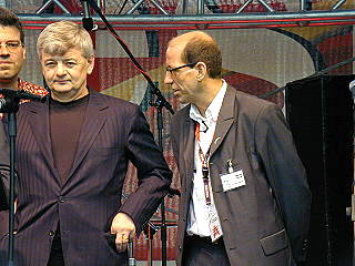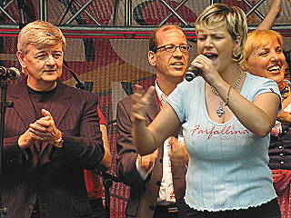 ![]() 15 Joseph Fischer, Koordinator Michael Schmidt und Claudia Roth im Mega-Tower West |